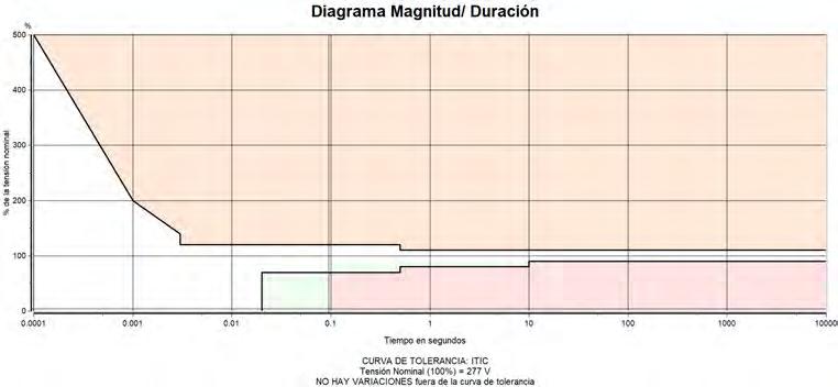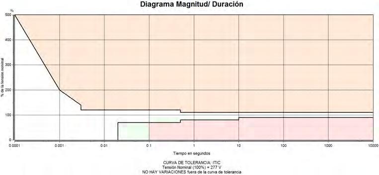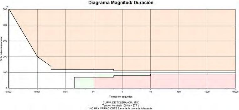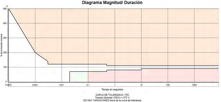 En la gráfica ITIC se muestran los eventos del centro de carga capturados durante la semana de monitoreo, uno se ubica en la región de funcionamiento sin interrupción y el otro en el límite, esta grafica solo es de referencia ya que el centro de carga no está obligado a evitar este tipo de eventos, sino a mantenerse conectado al SEN en todo evento dentro de los limites.