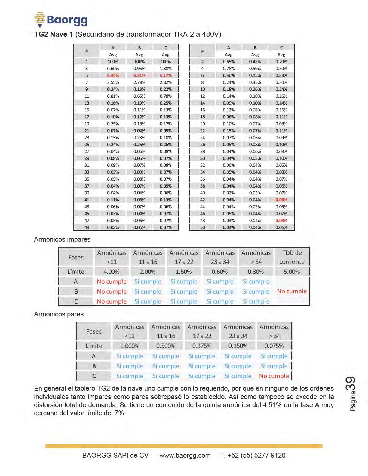 Observación: El valor más alto es el de la 5ª armónica con 8.818% con respecto a la corriente de la fundamental (480.17 A).