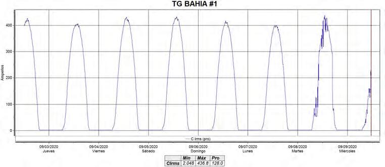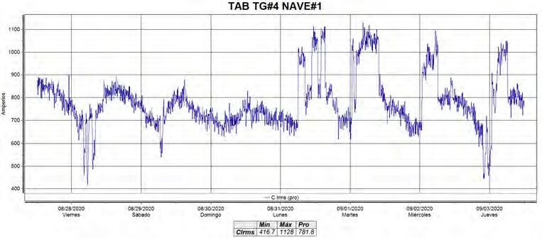 Observación: Se registra una corriente mínima RMS de 5.613 A, máxima RMS de 437.0 A y promedio de 128.8 A.