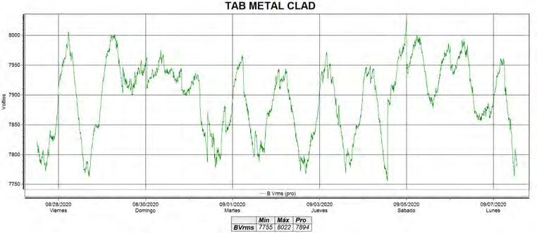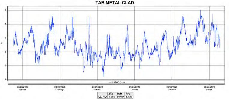 Como se observa en la gráfica anterior, el factor de potencia en el Metal Clad se mantiene entre 0.94 y 0.99. Durante el periodo de medición se registraron 3,179 datos de los cuales 3,160 se mantuvieron entre el 0.95 en atraso y 1 (línea roja), promediando un FP de 0.97 y manteniéndose dentro de los límites establecidos por el CR el 99.4% del tiempo