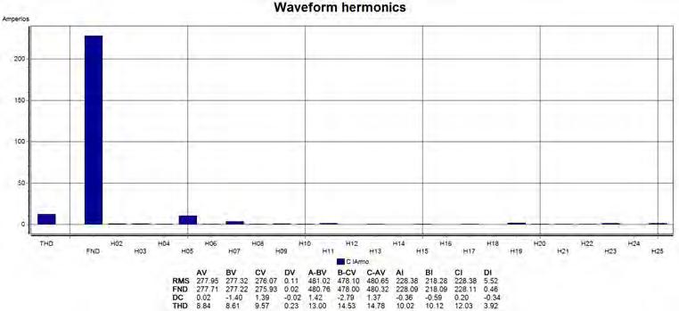 Observación: El valor más alto es el de la 5ª armónica con 22.07% con respecto a la corriente de la fundamental (228.09 A).