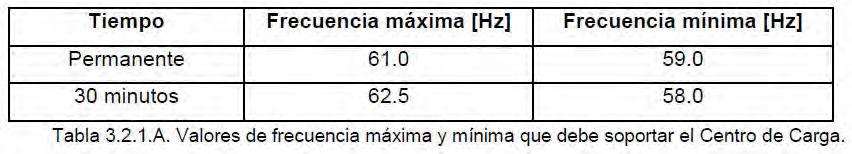 Los requerimientos para cumplir con el Código de Red se estipula que el centro de carga debe permanecer conectado a la red soportando variaciones de frecuencia conforme a lo siguiente: