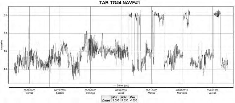 Observación: Se registra una corriente mínima RMS de 2.666 A, máxima RMS de 5.267 A y promedio de 4.019 A.