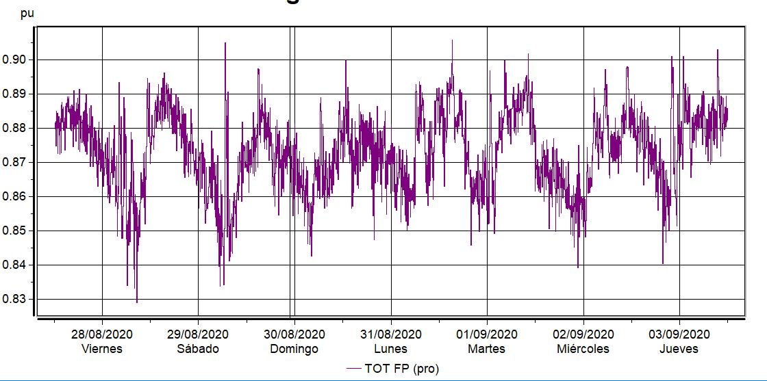 Observación: El factor de potencia oscila entre 0.8832 al 0.9335, siendo la unidad la frontera entre el retraso y el adelanto. En promedio se mantiene en 0.9023