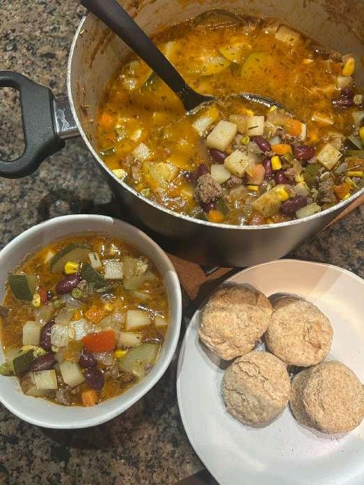 “Honestly, this came about as I was looking for a way to pack in the vegetables in a cheap, filling and tasty way, and because this soup is so flexible, it comes out different every time! It’s also easy to freeze and keep for later when time is short or exams are stressful. I typically serve it with homemade biscuits or bread and butter, but it’s good plain too :)”