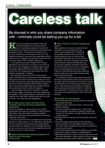 Meanwhile, the firm should: • Ensure that documents carrying sensitive information are destroyed securely. • M0onitor online references to itself – this can help identify imposters. • Carry out a systems ‘health-check’ – which could include tasking a consultant to attempt unauthorised entry to critical systems – and get professional advice on data security. • Educate staff on IT security and how to spot cybercrime red flags. • Follow the latest expert guidance (from GCHQ) on secure passwords – at least eight characters long, no dictionary words, change them only after a suspected or actual security breach. • Ensure that firewall and anti-virus software is up-to-date. • Use data encryption software in correspondence. • Make special efforts to protect access to applications like searchable databases – these can give criminals a way in. • Remember that weak controls make crime possible. NQ NQ Magazine June 2017