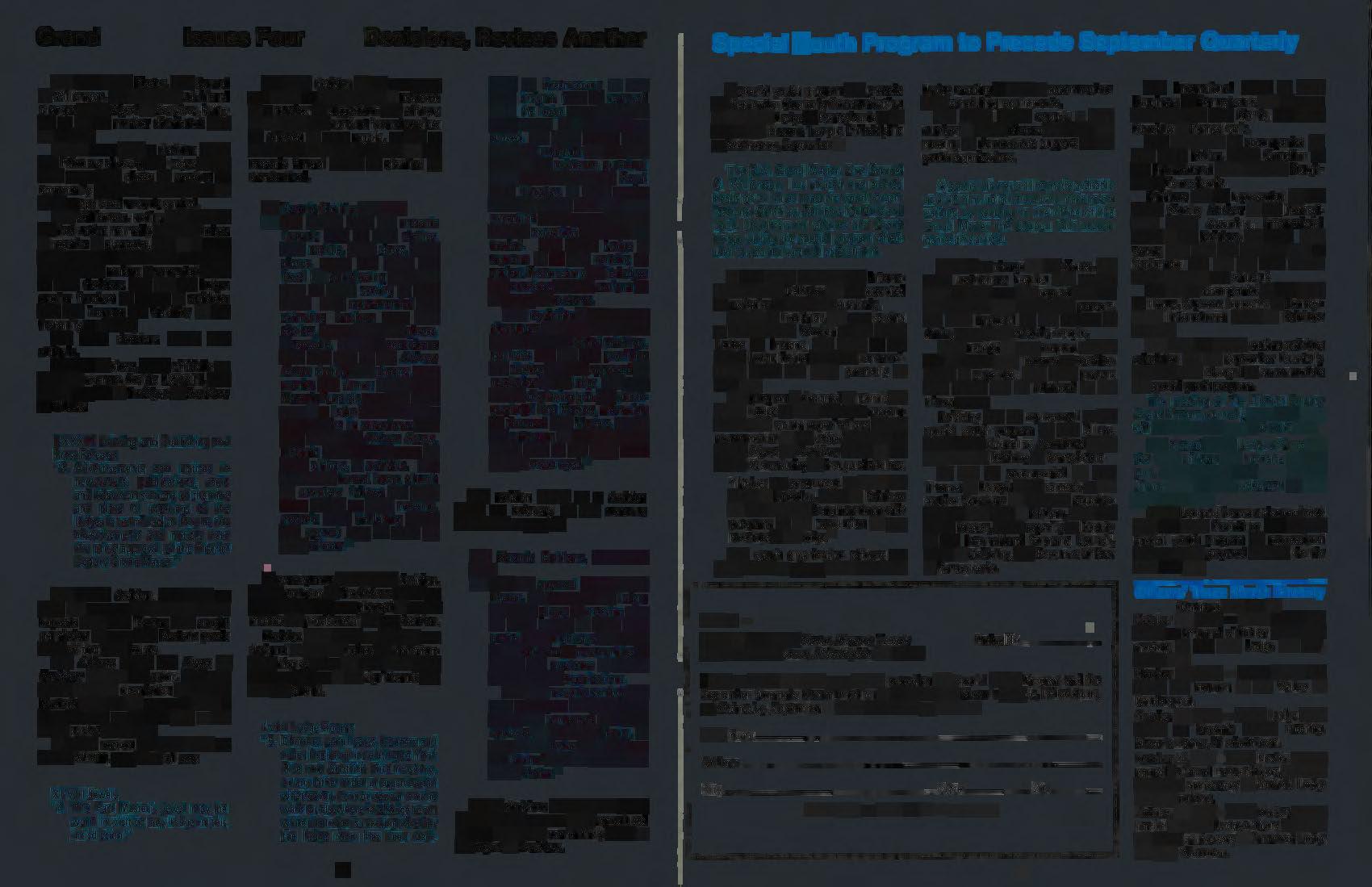 The meeting of the District Deputy Grand Masters, no rmall y set at 2 :00p.m., wi ll be he ld at 1:30 p.m. in Gothic Hall . The elected Grand Lodge officer s and the floo r office rs will rehearse at 3:45 p.m. rather than at 4: 00 p.m. , and the dinner hour has been advanced 15 min· utes to 4:45p .m. . Gra nd Lodg e offic e rs ar e al s o remind ed t hey will enter Cor inthi an Hall f or t he spec ia l yo uth p ro gram by processi on al and are to be prepared t o for m shor tl y af t er 6 :00p .m.