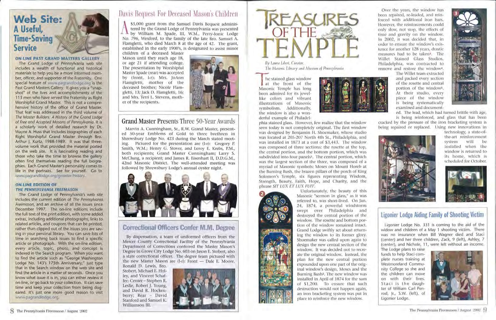 The Grand Lodge of Pennsylvania's web site Inc ludes the current edition of The Pennsylvonlo Freemason, and an archive of a ll the Issues since December 1997. The on-line editions include the full text of the print edition, with some added extras, including add itiona l photographs, links to related articles, and coupons that can be printed, rather than clipped out of the issues you are saving in your personal library. You can save lots of time in searching back issues to find a specific artkle or photograph. With the on-l ine edition, every article, topic, photo, and concept is indexed in the Search program. When you want to find the article such as "George Washington Lodge No. 143's 175th Anniversary," just type that in the Search window on the web site and find the article in a matter of seconds Once you know what issue it is in, you can either review it on-line, or go back to your co ll ection. It can save time and keep your collection from being dogeared It's just one more good reason to visit www.pagrandlodge.org.