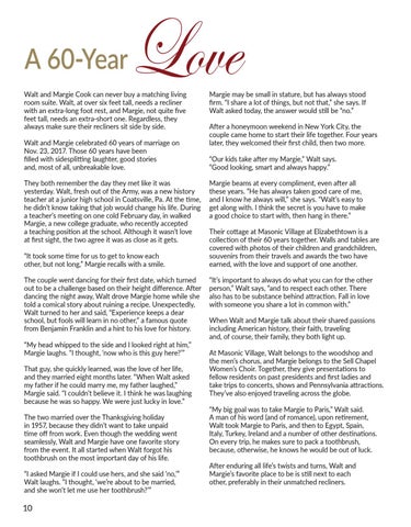 Margie may be small in stature, but has always stood firm. “I share a lot of things, but not that,” she says. If Walt asked today, the answer would still be “no.” After a honeymoon weekend in New York City, the couple came home to start their life together. Four years later, they welcomed their first child, then two more. “Our kids take after my Margie,” Walt says. “Good looking, smart and always happy.” Margie beams at every compliment, even after all these years. “He has always taken good care of me, and I know he always will,” she says. “Walt’s easy to get along with. I think the secret is you have to make a good choice to start with, then hang in there.” Their cottage at Masonic Village at Elizabethtown is a collection of their 60 years together. Walls and tables are covered with photos of their children and grandchildren, souvenirs from their travels and awards the two have earned, with the love and support of one another. “It’s important to always do what you can for the other person,” Walt says, “and to respect each other. There also has to be substance behind attraction. Fall in love with someone you share a lot in common with.” When Walt and Margie talk about their shared passions including American history, their faith, traveling and, of course, their family, they both light up. At Masonic Village, Walt belongs to the woodshop and the men’s chorus, and Margie belongs to the Sell Chapel Women’s Choir. Together, they give presentations to fellow residents on past presidents and first ladies and take trips to concerts, shows and Pennsylvania attractions. They’ve also enjoyed traveling across the globe. “My big goal was to take Margie to Paris,” Walt said. A man of his word (and of romance), upon retirement, Walt took Margie to Paris, and then to Egypt, Spain, Italy, Turkey, Ireland and a number of other destinations. On every trip, he makes sure to pack a toothbrush, because, otherwise, he knows he would be out of luck. After enduring all life’s twists and turns, Walt and Margie’s favorite place to be is still next to each other, preferably in their unmatched recliners.