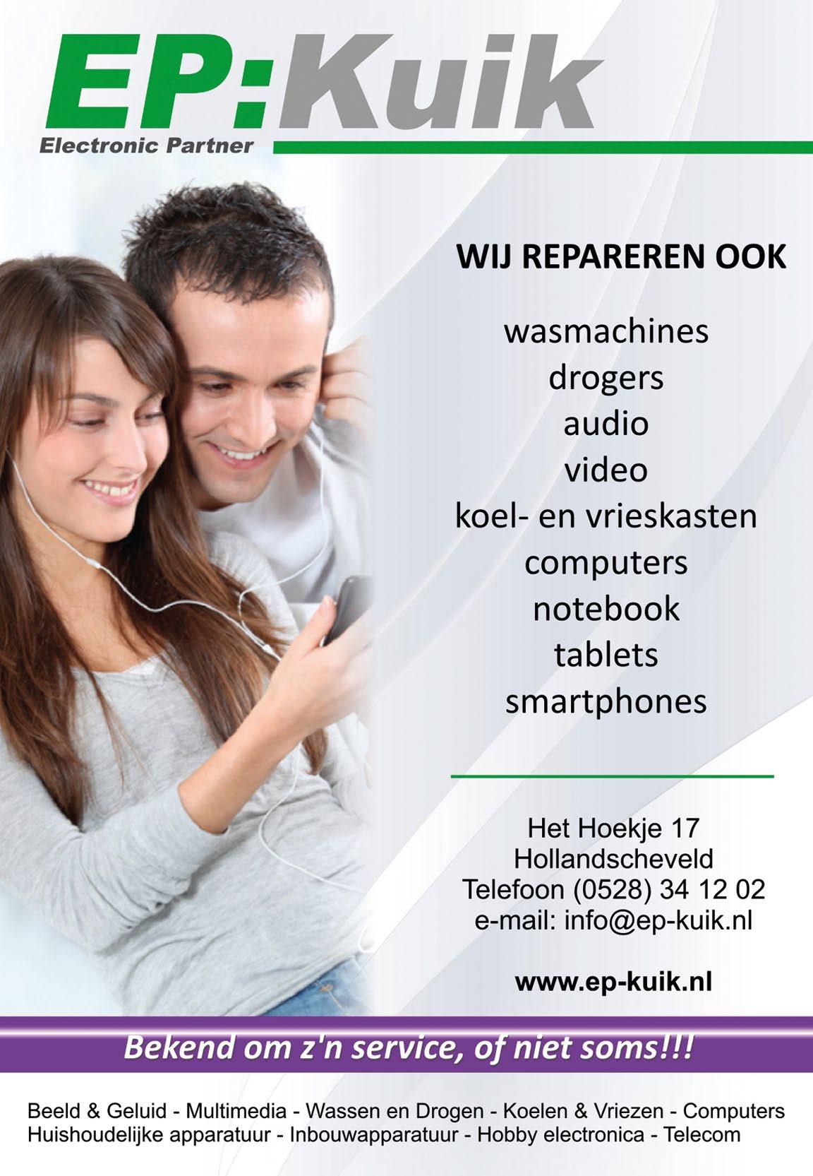 Samen groot worden Kinderdagverblijf l Buitenschoolse opvang Stok 2, 7913 ER Hollandscheveld l 0528 - 344 155 hoogeveen@prokino.nl | www.prokino.nl/hoogeveen Kindercentrum van Prokino De Veldkabouter Het Hoekje 4, Hollandscheveld - De Wielewaal 12, Hoogeveen www.versspecialist.com Aardappelen - Groente - Fruit Salades - Vers gebrande nootjes - Kaas Onze openingstijden zijn: Ma t/m vr 08.00 - 12.00 13.00 - 17.30 Za 08.00 - 12.00 13.00 - 15.00 De Bandenbeurs VOF - Zuideropgaande 123 - Hollandscheveld