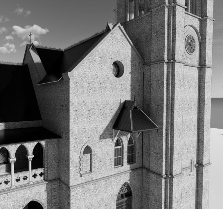DETAIL OF ROOF CRESTING 3D VISUALIZATION OF ROOF CRESTING VIEW OF ROOF CRESTING WITH FINIALS EXISTING CONDITION OF ROMAN CLOCK ON BELFRY 3D VISUALIZATION OF ROMAN CLOCK VIEW OF ROMAN CLOCK ON BELFRY EXISTING CONDITION OF ROSE WINDOW 3D VISUALIZATION OF ROSE WINDOW