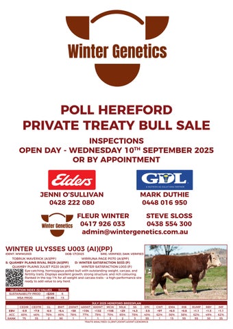 June 2023 Southern Limousin BREEDPLAN GL BWT 200WT 400WT 600WT MCW MLK SS CWT EMA RIB RUMP RBY IMF DOC EBV -3.3 +1.5 +22 +38 +55 +55 +12 +2.5 +31 +1.9 +0.0 +0.1 +0.5 +0.2 +34 Acc 55% 59% 60% 61% 58% 45% 33% 67% 47% 42% 52% 51% 45% 39% 53% Rank % 28% 45% 44% 42% 35% 38% 7% 1% 54% 50% 40% 25% 75% 15% 71% $Index Values Yearling Prime ($) +$42 Domestic Maternal ($) +$27 Export Maternal ($) +$53 Northern Export ($) +$79 Traits Observed: CE,200WT,400WT(x2),SS,FAT,EMA,IMF,DOC Sire Verified 59