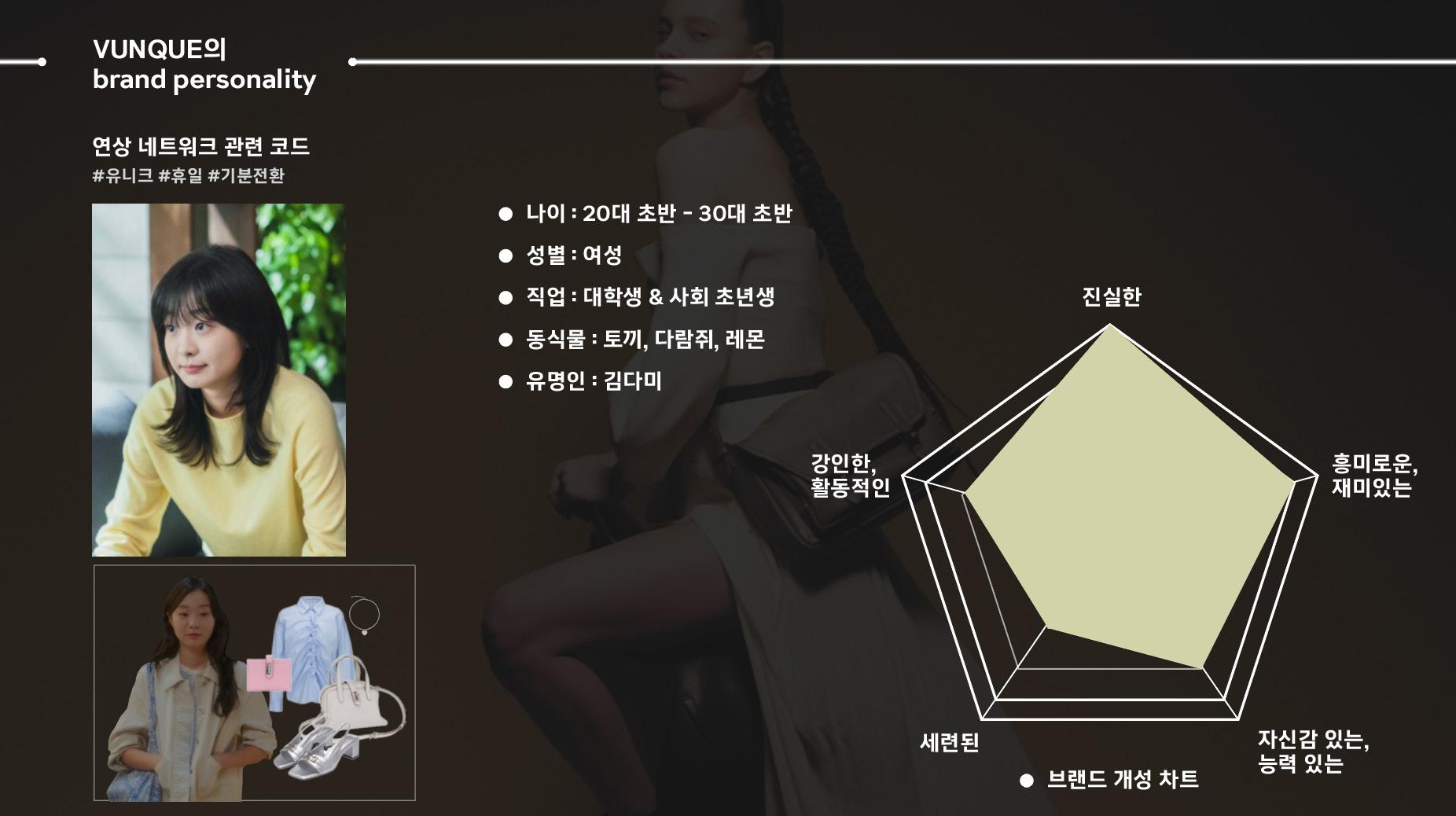나는 깔끔한 스타일도, 화려한 스타일도, 귀여운 스타일도, 멋진 스타일도 다 좋아한다. 정해진 스타일이 있다기보다, 옷 입을 때나 가방을 들 때 나의 기분과 그날의 욕구가 가장 중요하다. vunque의 제품들을 보면 하나의 명확한 톤앤매너가 있다기 보다 분야별, 테마별로 구분된 모 습을 보여준다. 어떨 때는 정장을 입고 회사에 출근하는 커리어우먼이 맬 것 같은 가방 같기도 하고, 비니와 선글라스를 끼고 깔쌈하게 걷는 힙합 하는 언니 같기도 하다. 또 풋풋하고 귀여운 새내기의 느낌이 날 때도 있다. 정해진 틀이 있는 것이 아니라 그날의 기분 따라 다양한 모습을 보여줄 수 있는 vunque의 다채로움이 내가 추구하는 라이프 스타일과 비슷한 것 같다.