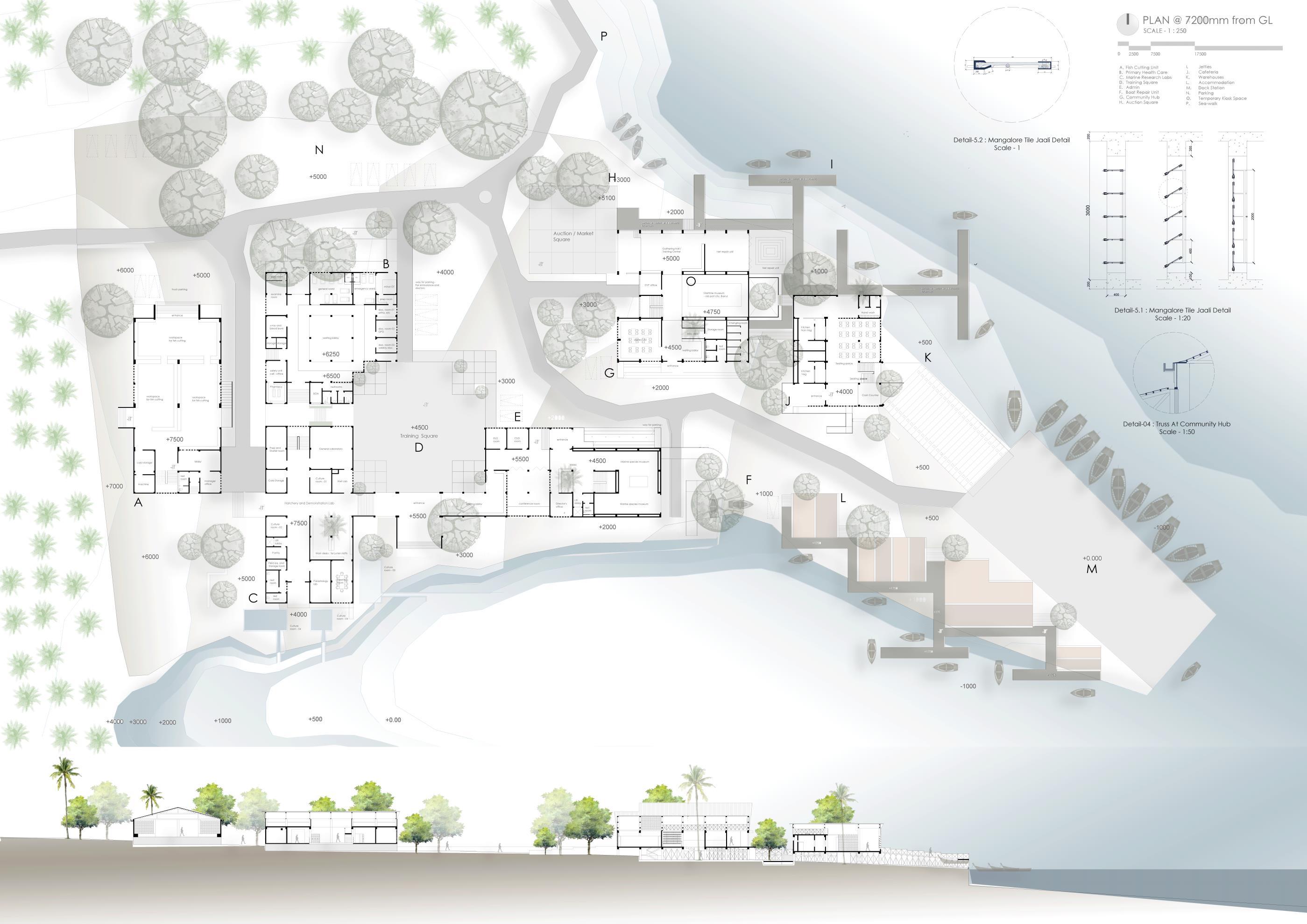 The section depicts the various levels and integration of green buffers with the public Centre and the terminal SCALE – 1:250