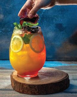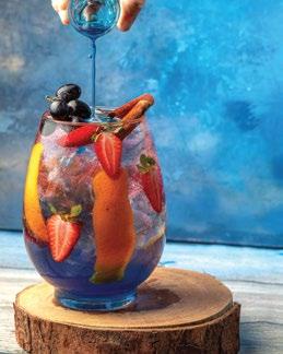 Gin, Monin de blue curaçau e de romã, soda e sumo de limão e angustura bitter Finalizado com limão siciliano, morango, gengibre, canela em pau e servido na nossa garrafa personalizada.