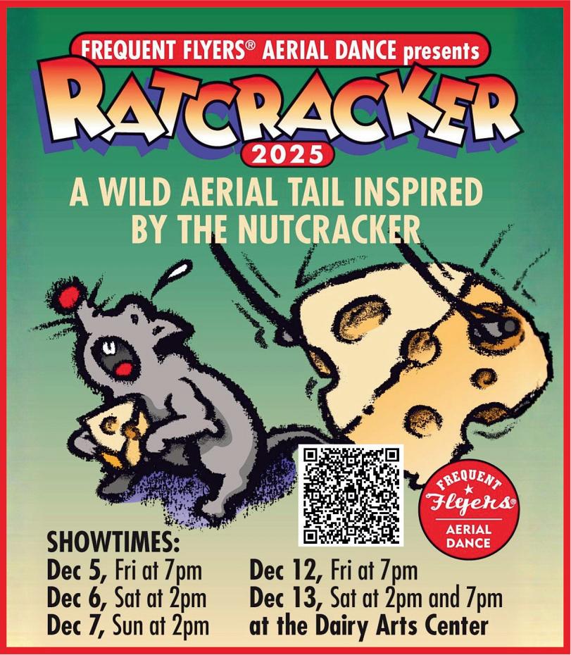 Swing into the holidays with RATCRACKER! This wild aerial “tail” flips The Nutcracker on its head, taking audiences on a high-flying adventure where gravity takes a holiday. Dancers soar on trapeze, aerial fabric, bungee, stilts, Spanish web – even a flying bed in this topsy-turvy, family fun show! See website for times $29-$33. Dairy Arts Center, 2590 Walnut St., Boulder, frequentflyers.org/ratcracker