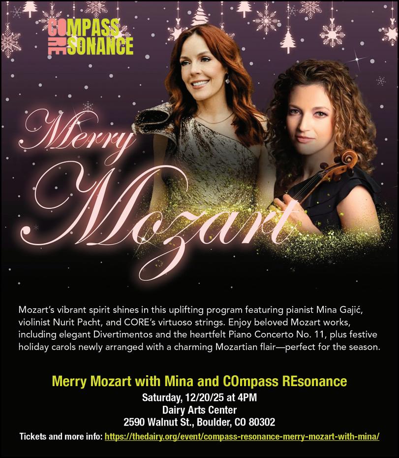 Merry Mozart with Mina Mozart’s vibrant spirit shines in this uplifting program featuring pianist Mina Gajić, violinist Nurit Pacht, and COmpass REsonance's virtuoso strings. Enjoy beloved Mozart works, including elegant Divertimentos and the heartfelt Piano Concerto No. 11, plus festive holiday carols newly arranged with a charming Mozartian flair—perfect for the season. 4 p.m., $23–$82.50. Dairy Arts Center, 2590 Walnut St., Boulder, thedairy.org/event/compassresonance-merry-mozart-with-mina