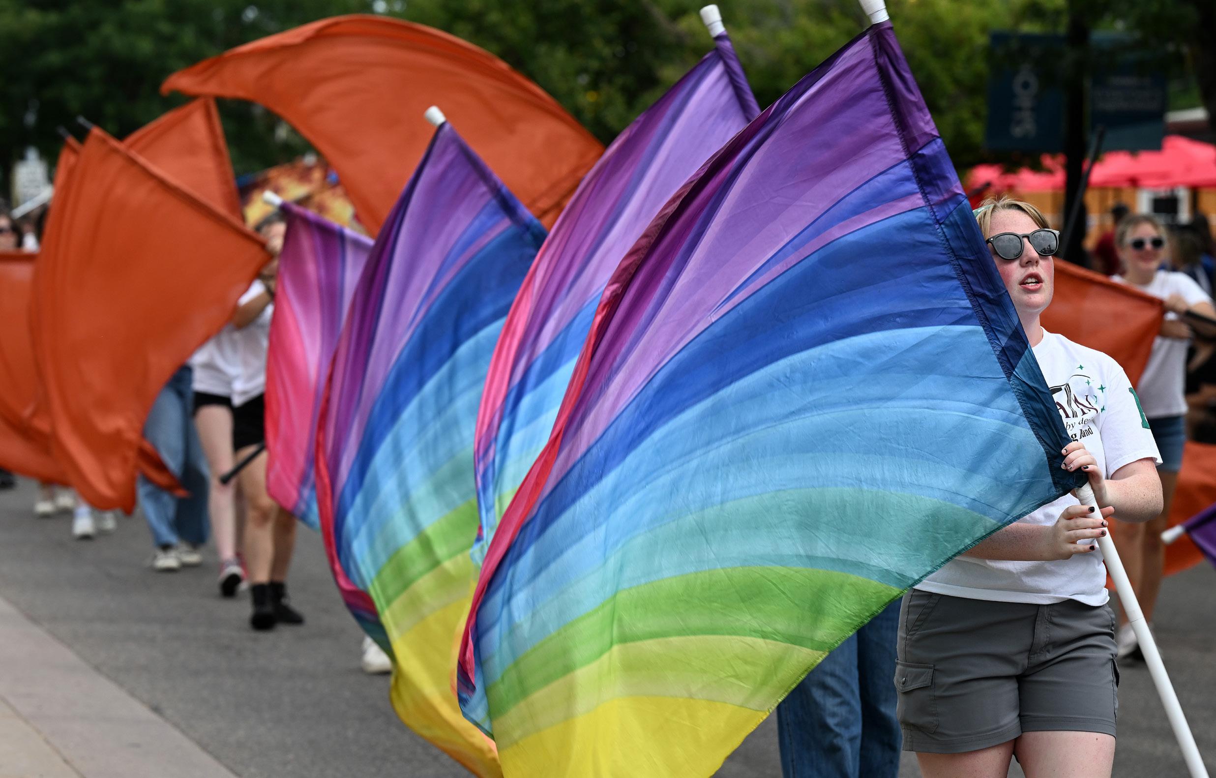 The flag team of the St Vrain Valley All-District Marching Band performs during the Boulder County Fair Parade on Main Street in Longmont on Aug. 2