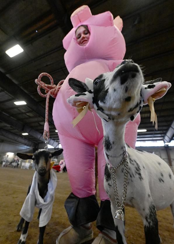 Alannah Blocksom, wearing an inflatable pig costume, stands with her goats Midland, left, and Billy Jean, right, at the goat costume contest during the Boulder County Fair on Aug. 6