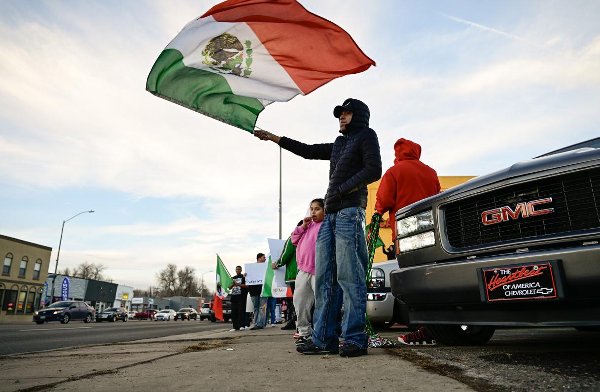 Around 20people hold signs and Mexican flags during a demonstration in support of Mexican immigrants outside of the Carniceria El Cerrito on Main Street in Longmont on Feb. 3