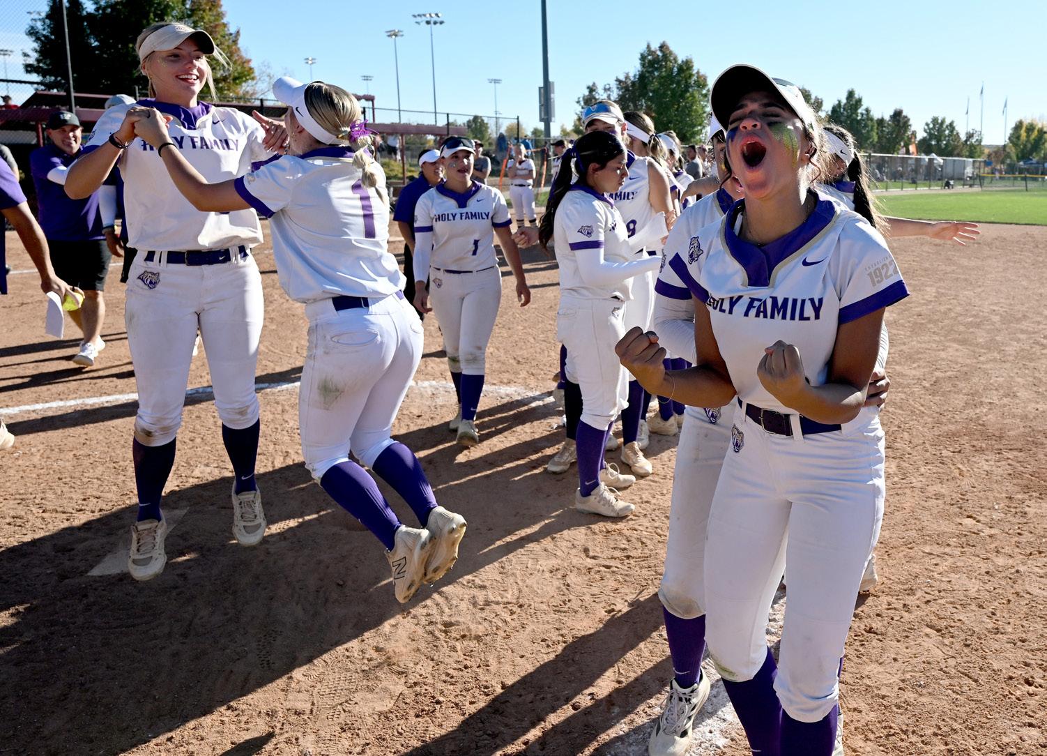 Holy Family’s Aaliyah Hill, right, celebrates winning the 4A Girls Softball state championship with her teammates on