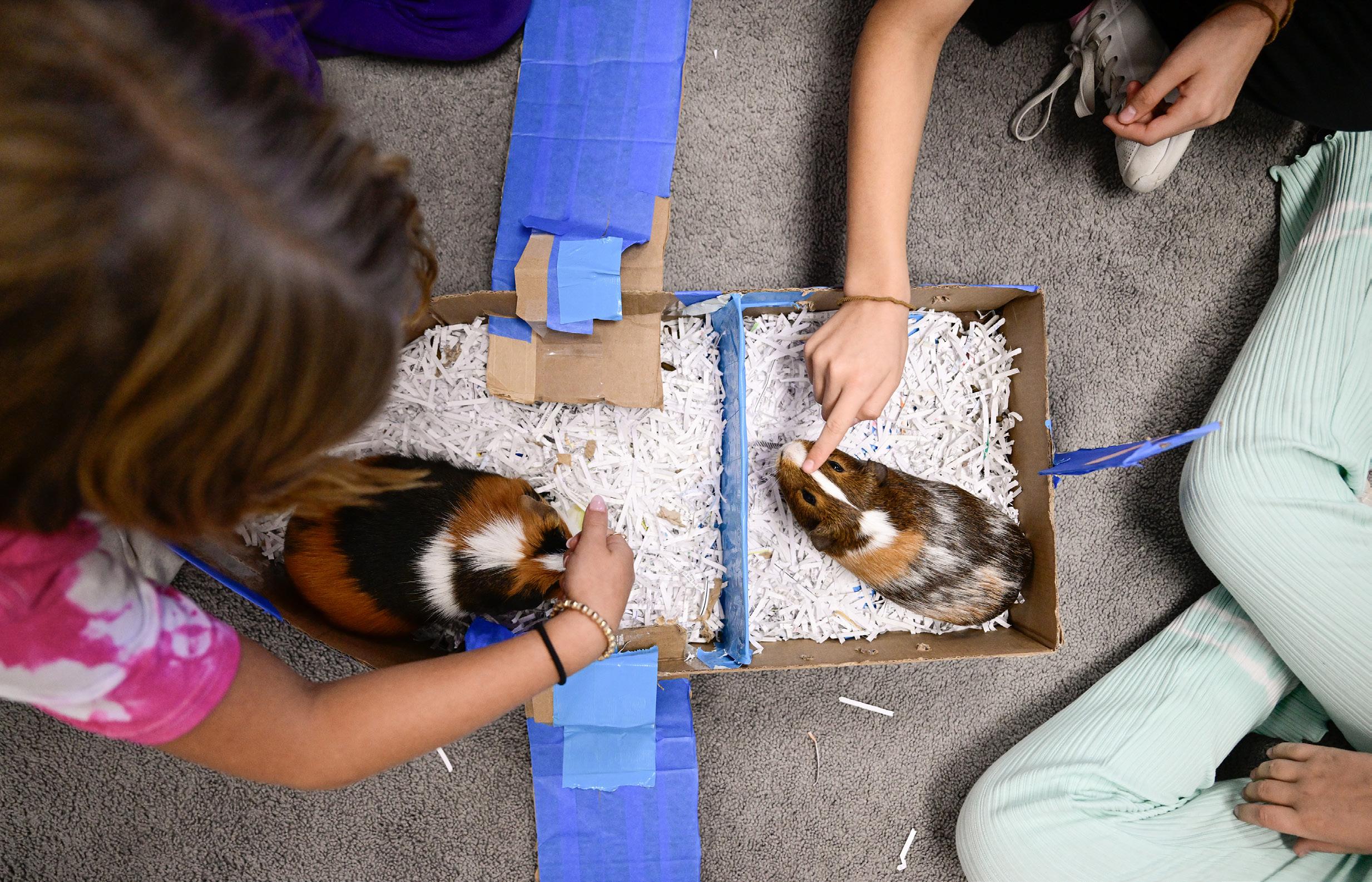 Guinea pig election candidates Sneffels, left, and Belford, right, hang out in a cardboard box decorated to resemble Air Force One in fourth grade teacher Amanda Demler’s class at Boulder Country Day School on Friday, Nov. 1, 2024.