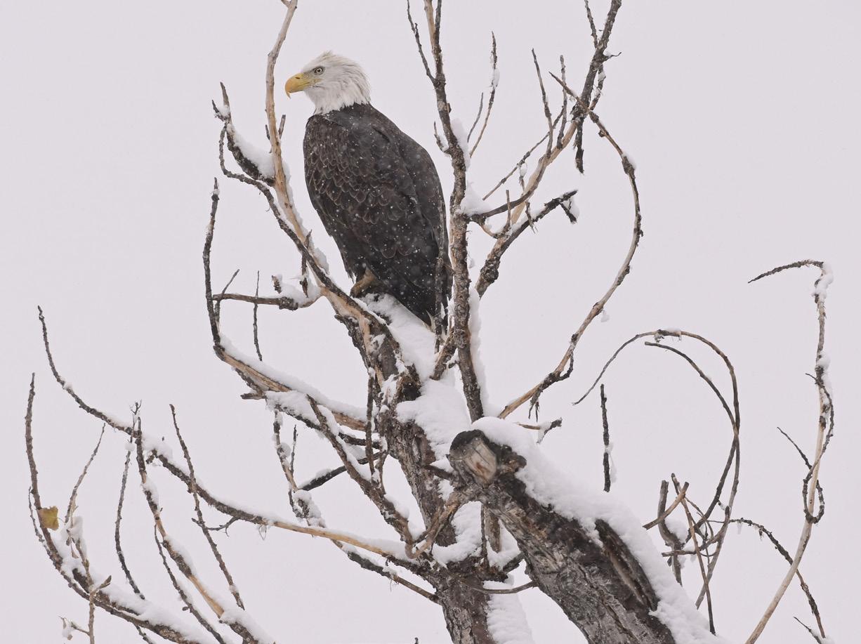 A bald eagle sits in a snow-covered tree overlooking McIntosh Lake in Longmont on Friday, Nov 8, 2024.