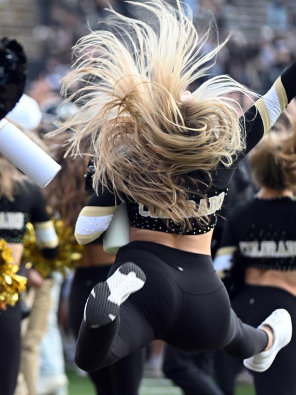 A member of the University of Colorado Boulder dance team flies into the crowd of fans on the field after the Colorado Buffaloes beat the Iowa State Cyclones at Folsom Field on Oct. 11.