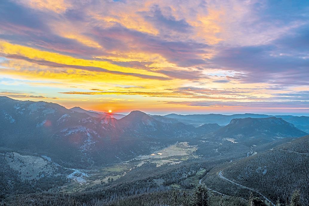 Thesun risesabove LumpyRidge during alate-summer sunrise lookingout over HorseshoeParkfromRainbow CurveinRocky Mountain National Park,Colorado.