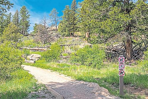 Afterafew more junctions with climber-accessroutes (continuetostaytothe left at thejunctions with theBook area andthe Pear rock outcrop), hikers will reachanothergateat2.1 miles. This gate marksthe boundary of RockyMountainNational Park.