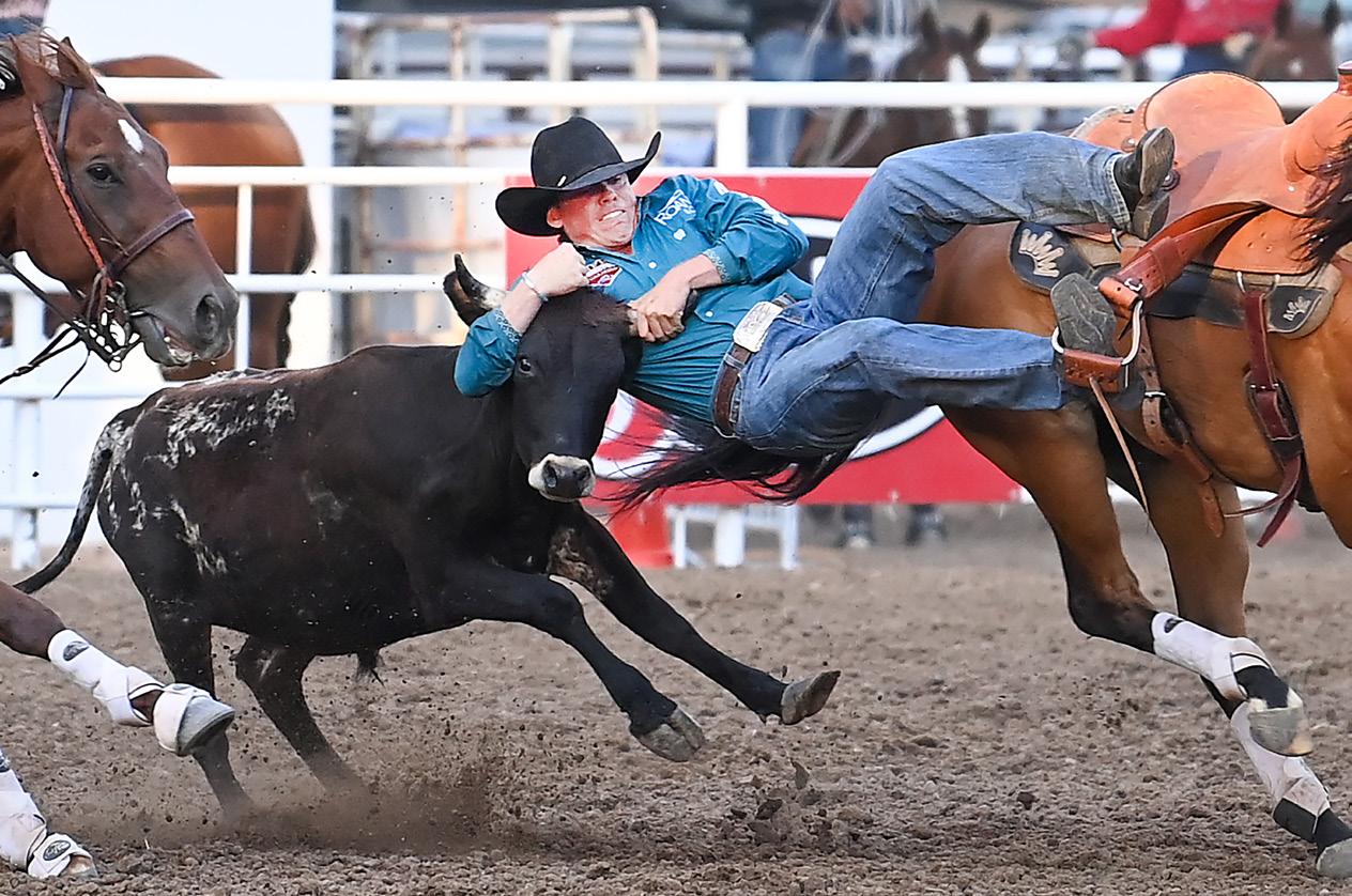 Steer wrestler Tucker Allen rips down a steer in 4.5seconds to win the event during the PRCA Rodeo finals at the Greeley Stampede Arena on July 2.