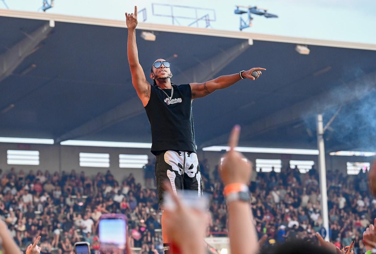 Artist Ludacris gets the crowd pumped while playing at the Greeley Stampede Arena on June 27.