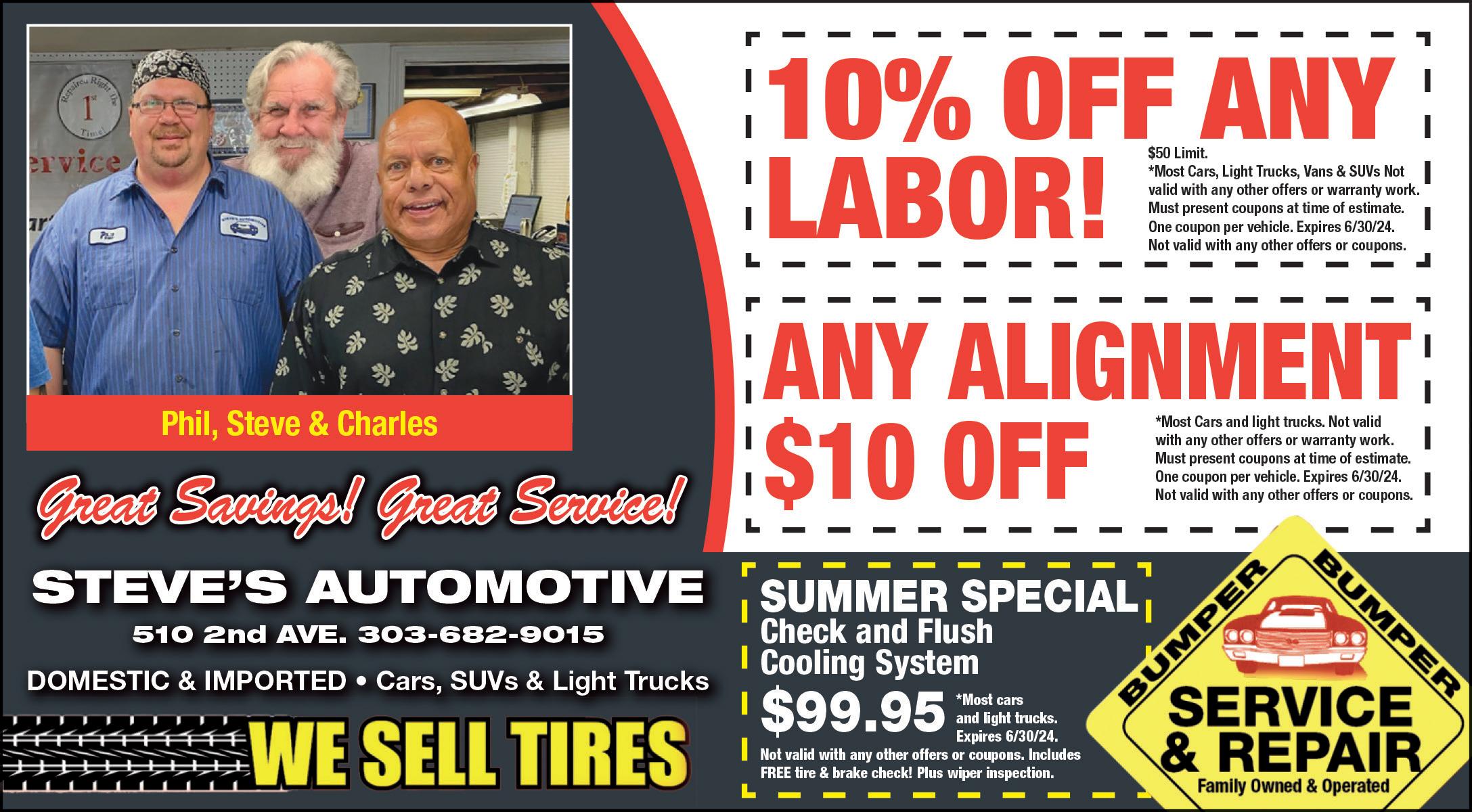 NOW WITH AUGMENTED REALITY! See Table of Contents page for details. GREENLIGHTSAVINGS.COM STEVE’S AUTOMOTIVE 510 2nd AVE. 303-682-9015 WE FIX IT RIGHT… THE FIRST TIME! OUR SERVICE INCLUDES: Free Inspections Complete written estimates before work begins Most vehicles in & out the same day Clean reception area & waiting room Alignment-Brakes-Suspension Specialists Free Shuttle Service GREAT PRICE! Longmont’s Specializ ed Wheel Alignment & Brake Facility OIL CHANGE $10. OFF • Oil Change • Tire Rotation • Brake Inspection • Belts • Hoses • Fluid Levels Expires 6/30/24. Not valid with any other offers or coupons. 5W30 up to 5 quarts.