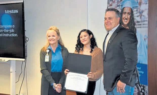 OnFriday,Gonzalesreceivedhercertificatein manufacturingfromtheU.S.DepartmentofLabor. Thecertificateisnationallyrecognizedandallows Gonzalesmoreworkoptions,accordingtoWesley Patch,headofoperationsatVestasinWindsor.