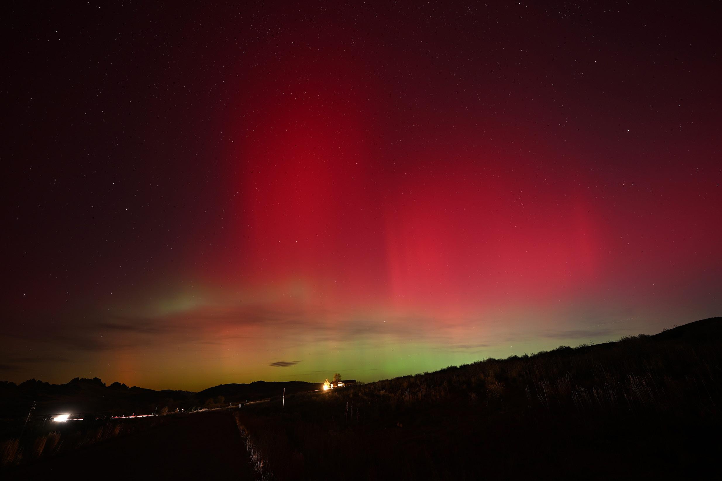 The Northern Lights create a colorful sky Nov. 11, 2025, near the Devil’s Backbone Open Space west of Loveland