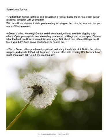 Some ideas for you: ~ Rather than having fast food and dessert on a regular basis, make "ice cream dates" a special occasion with your family. With small kids, discuss it while you're eating focusing on the color, texture, and temperature of the ice cream. ~ Go for a drive. No really! Go out and drive around, with no intention of going anywhere. Open your eyes to see interesting or unusual buildings and landscapes. Discuss what the land would have looked like years ago. Talk about how different things would feel if you didn't have an air conditioned or heated car. ~ Find a flower, either purchased or picked, and study the details of it. Notice the colors, shapes, and seeds. If God put this much time and effort into creating little flowers, how much more care did He put into creating us?