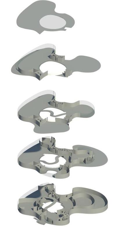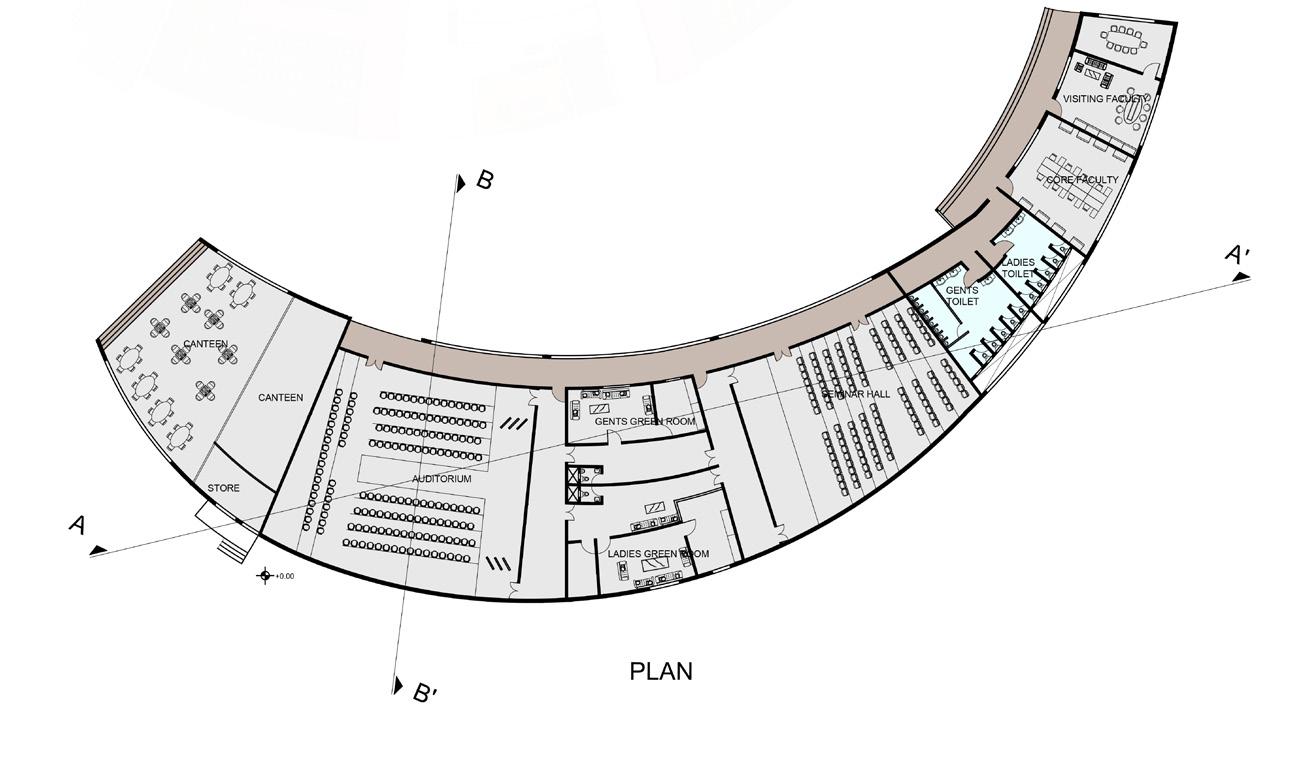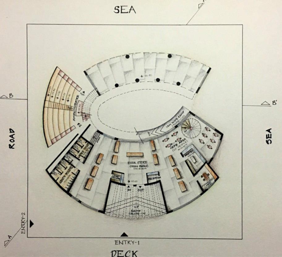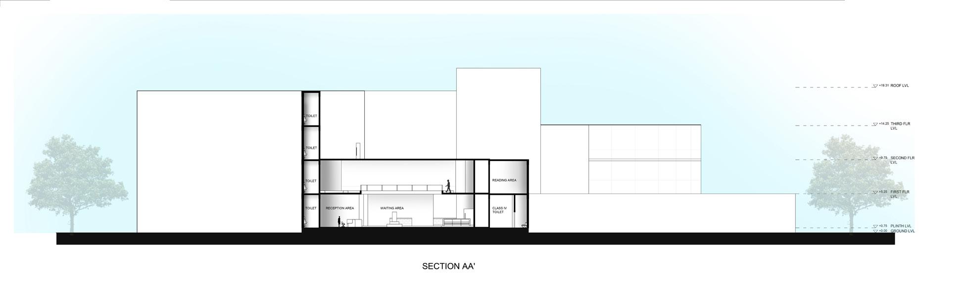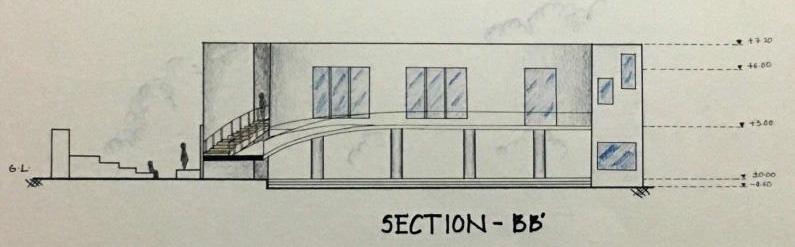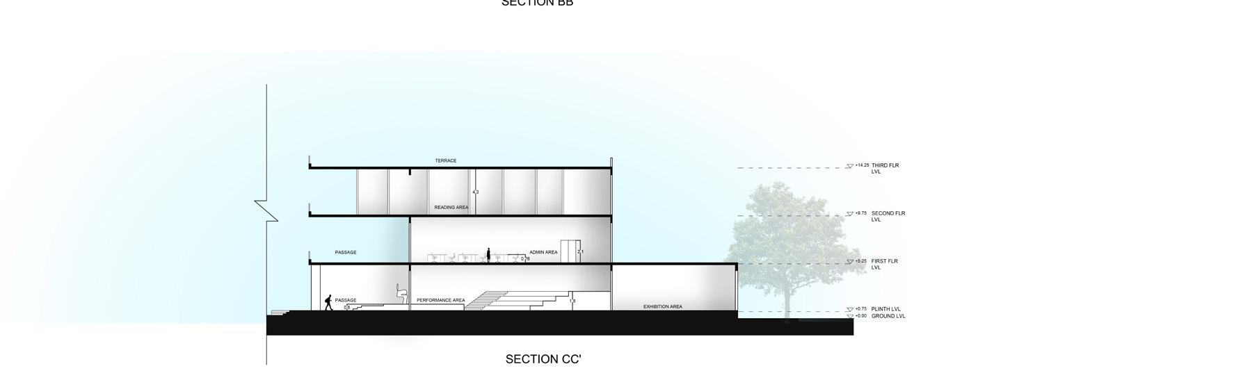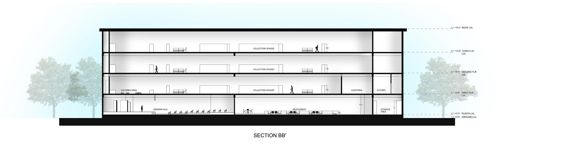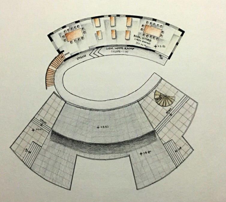 The design of Public Library is a fluid form having a central courtyard. All the floorplates serve as strong horizontal element of the structure. To connect these floor plates, ramps are given in the courtyard. The structure designed considering universal design guidelines, go upto three floors. The interactive spaces created on each floor gives openness to the structure providing healthy environment to the user.