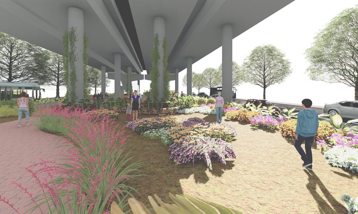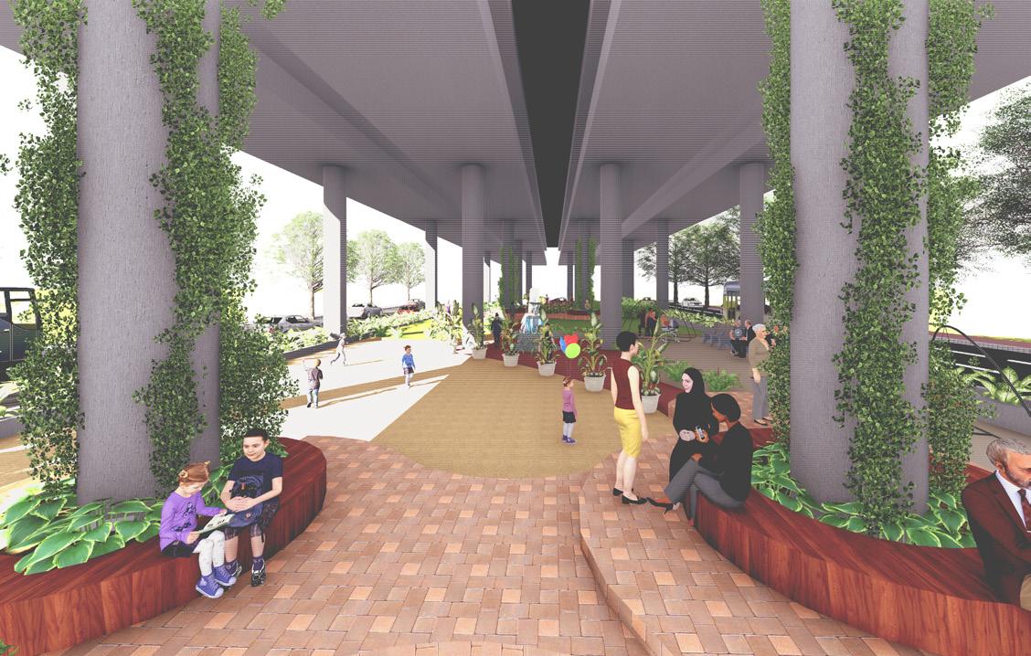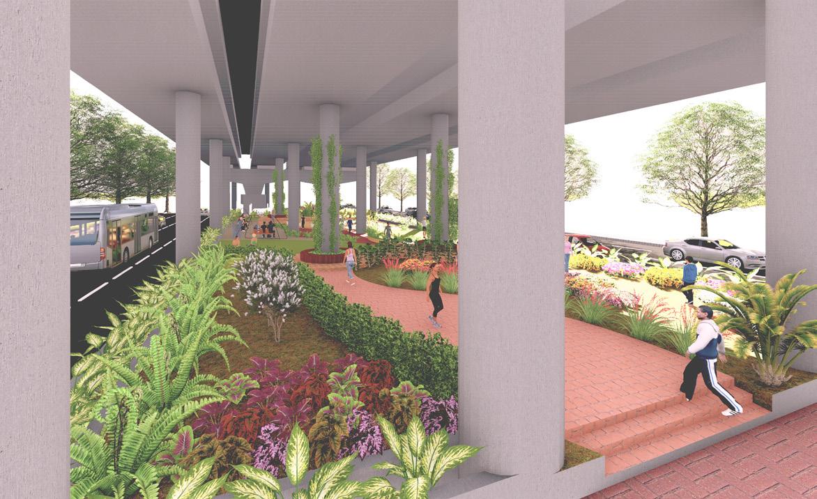 The unused space under flyover in the middle of the city has to be designed to attract people in the neighbourhood and make it lively area. The main challenge was to cut the site from air and sound pollution from adjacent highway. I have used plants which grows in minimum sunlight and high pollution to create a beautiful garden which will attract users from all age groups.(e.g. Bougainvillea, Peace Lilly, Crotons, etc.)