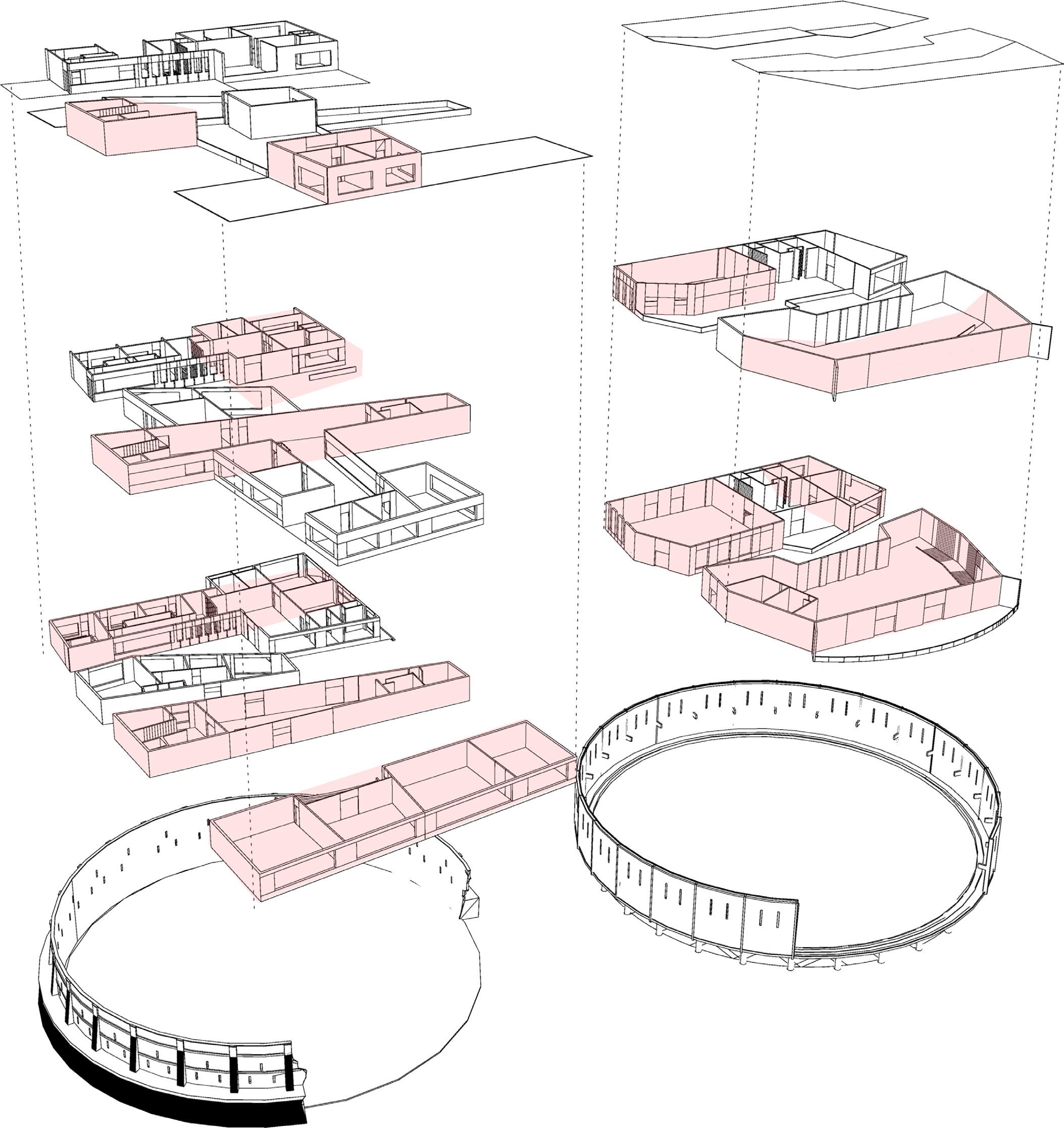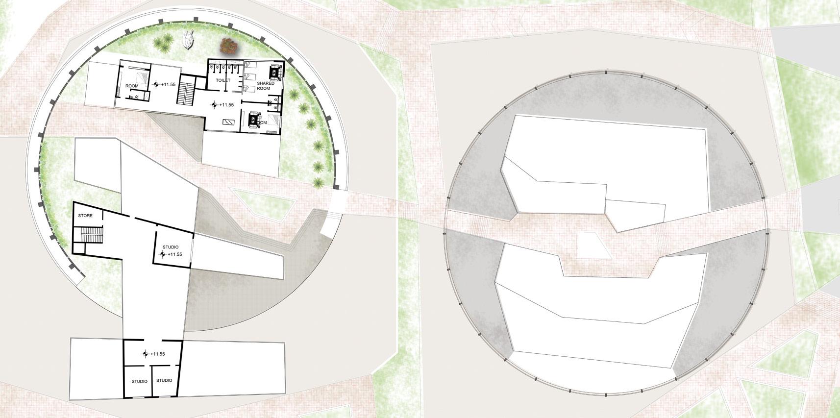 The redesign of the water tank is approched in a way to make the spaces familier and comfortable to the local artists, living in the surrounding fabric.