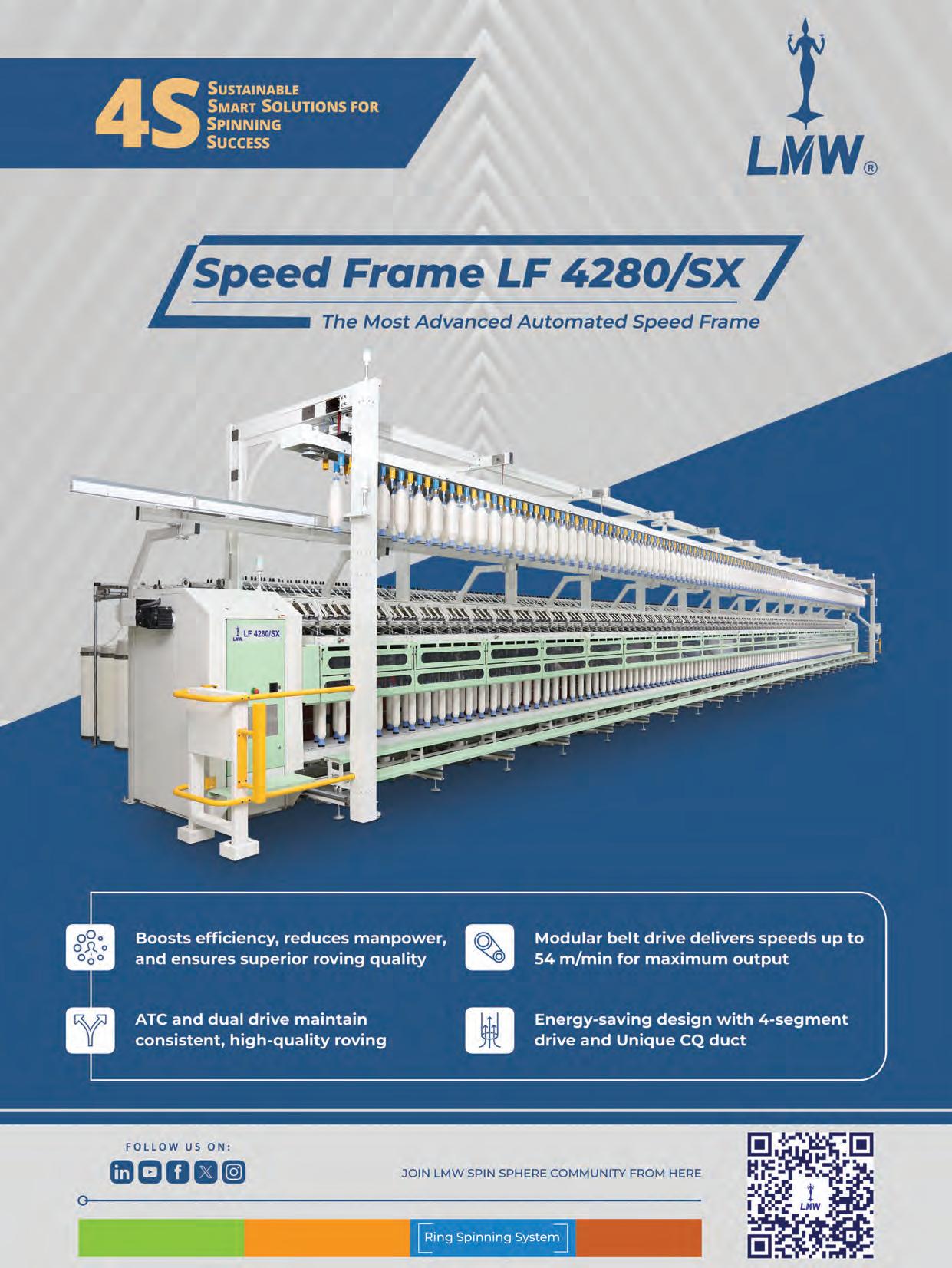 LMW'sextensiverangeofmachinery,fromblow room equipment to ring spinning frames, has empowered LSS Mills to reach impressive productivityandqualitystandards.Byintegrating LMW machines across the entire production process, they ensure consistency and efficiency, reinforcingtheirpositionasapreferredsupplierto high-endtextilemanufacturers.