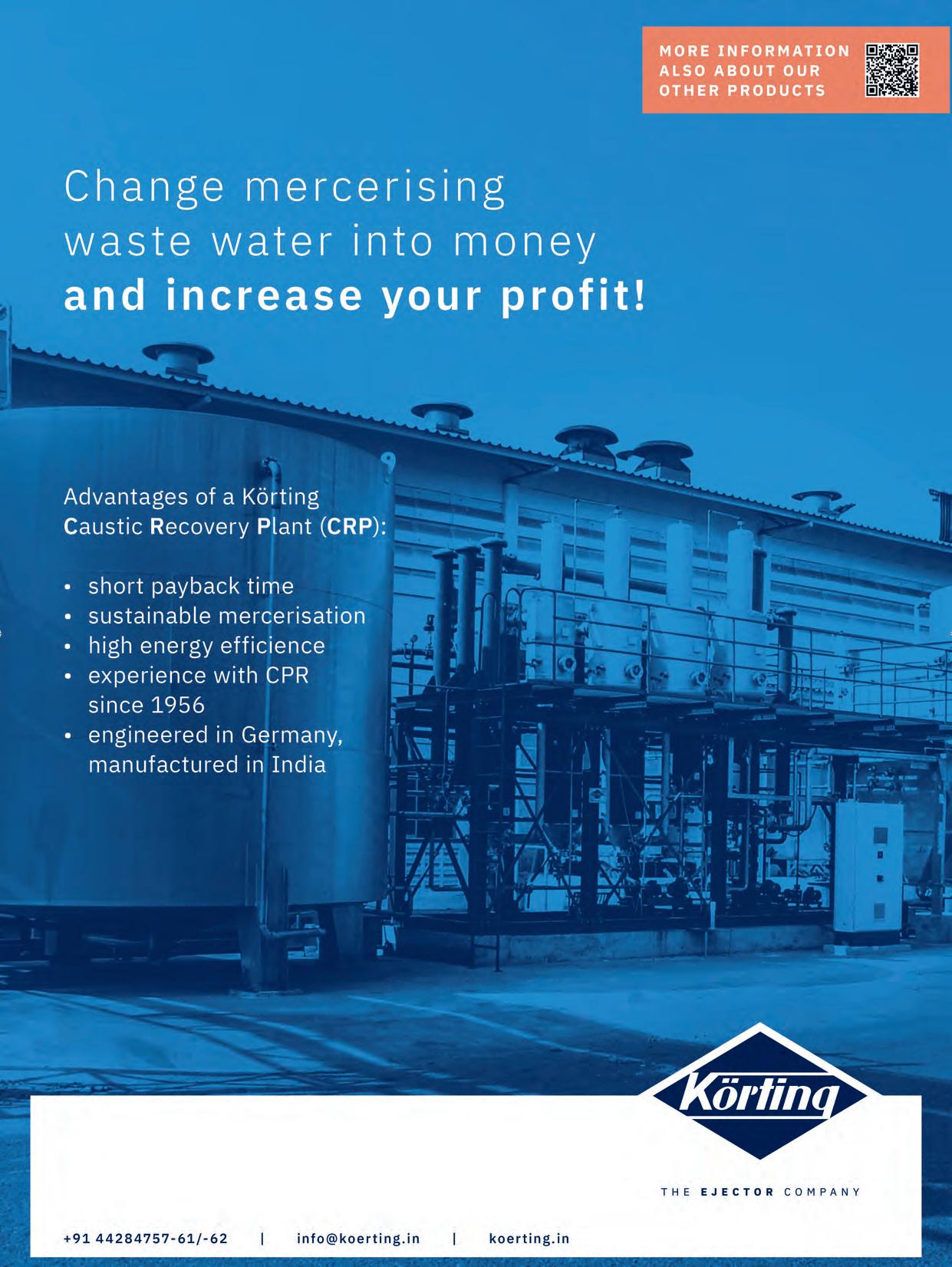 Ÿ KoertingEngineeringPrivateLtd.madea significant impact with their state-of-the-art Caustic Soda Recovery Plants (CRP). As a global market leader in caustic soda recovery systems, Koerting highlighted their innovative technologyforconvertingwastethincausticsoda into reusable thick caustic soda. With over 200 systemsinstalledinmorethan50countriessince 1956, Koerting’s CRP solutions are known for sustainability, energy efficiency, and short payback periods—revolutionizing the mercerizationprocessinthetextileindustry.