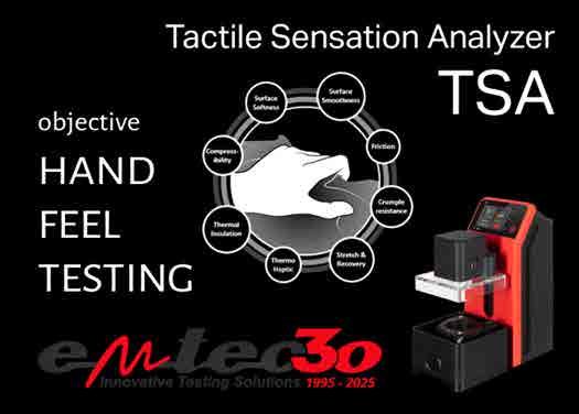 At ITMAASIA+ CITME 2025, emtec Electronic GmbH will introduce a new dimension in the world of textile touch analysis with its TSA Tactile Sensation Analy er and irt al a tic ibrary. This innovation transforms how the industry perceives and measures the “hand-feel” of textiles — bringing objectivity, speed, and digital precision to what was once a purely subjective experience.