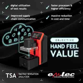 As e tecElectroniccelebratesits 0t anniversary, this milestone marks the company's expanding footprint in the textile sector. With decades of expertise in precision testing for paper and nonwovens, emtec is now set to revolutionize textile material evaluation. Managing Director Gisel erGr ener calls ITMAASIA“the perfect stage to showcase the future of objective handfeel analysis.”