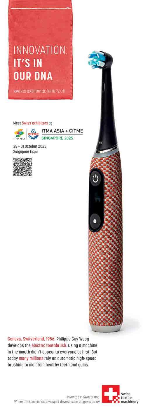 Balancingeconomiccompetitivenesswith sustainability is one of the central challenges for textile producers worldwide, and the Swiss textile machinery industryisdeeplyengagedinsupportingthis transformation. The focus lies in technologies that combine energy efficiency, reduced consumption of water and chemicals, and longer machine lifecycles with highly flexible production setups. Many solutions integrate digital process control to minimize waste and optimise resource use in real time. For manufacturers in Asia, where cost pressures are particularly acute, Swiss innovations aim to lower operating expenses while simultaneously meeting growing environmental requirements. By setting benchmarks in precision and durability, Swiss machinery helps customers in Asia and beyond to achieve both cost efficiency and environmental responsibility, without compromising on product quality.