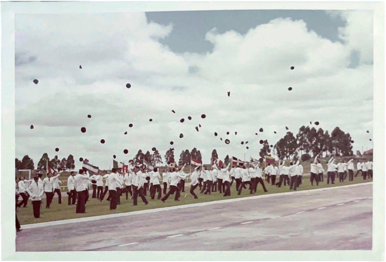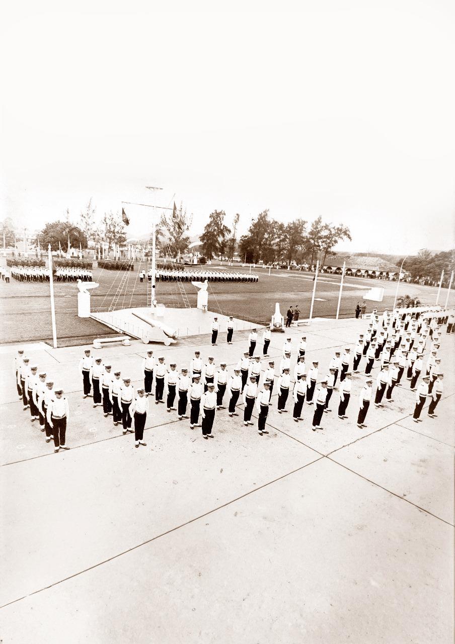 • Cadetes da Turma 1969 em forma após o desembarque;