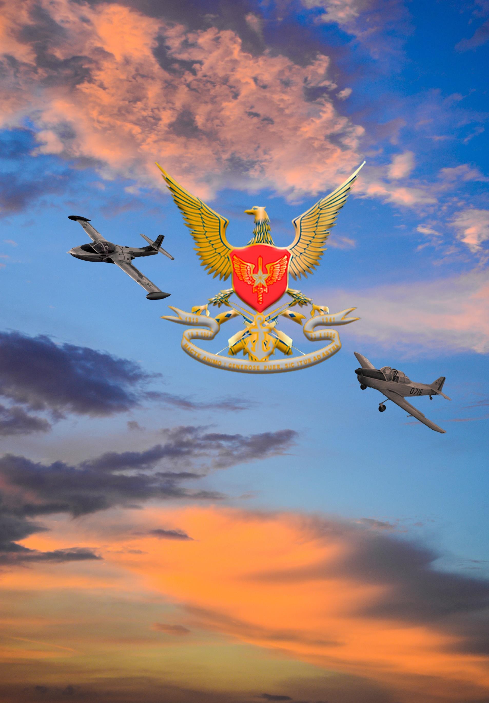 A fotomontagem ilustra a apresentação ao Comandante do Corpo de Cadetes da Aeronáutica e a recepção pela formação em voo de um C-119 escoltada por quatro T-37C.