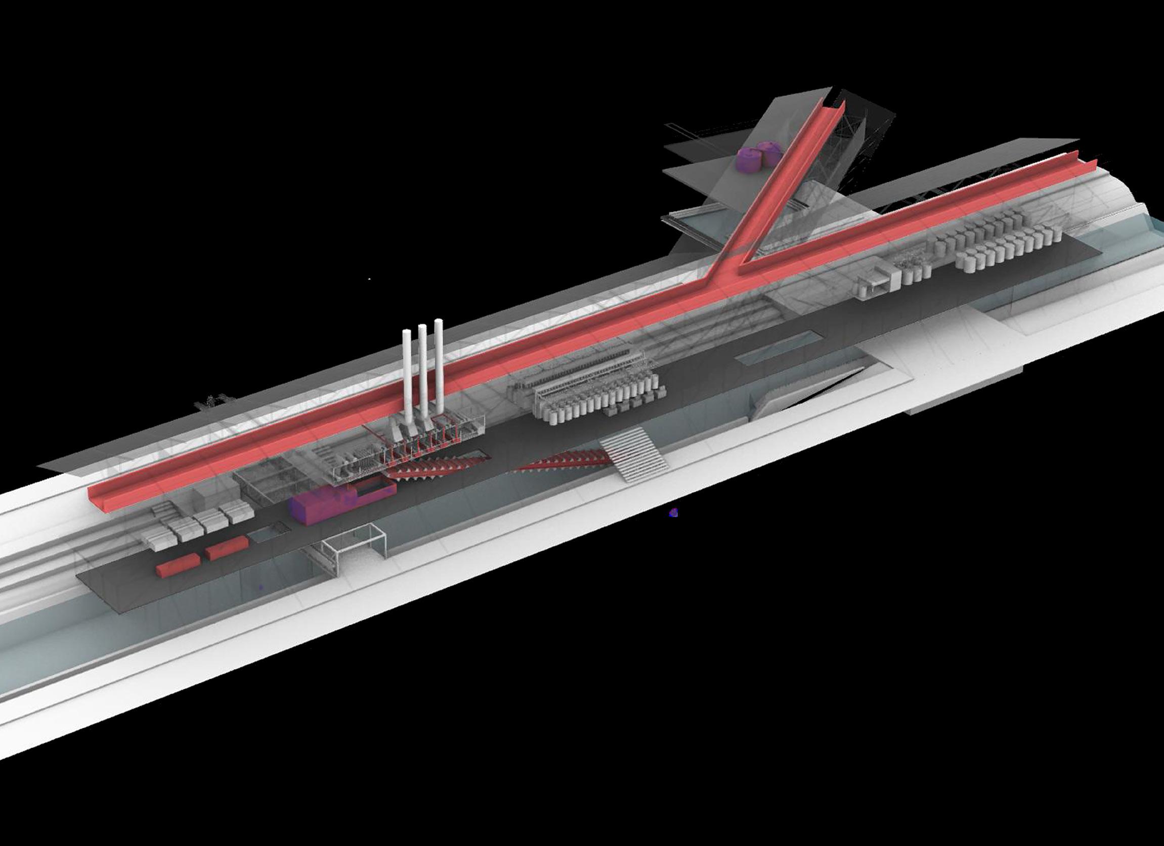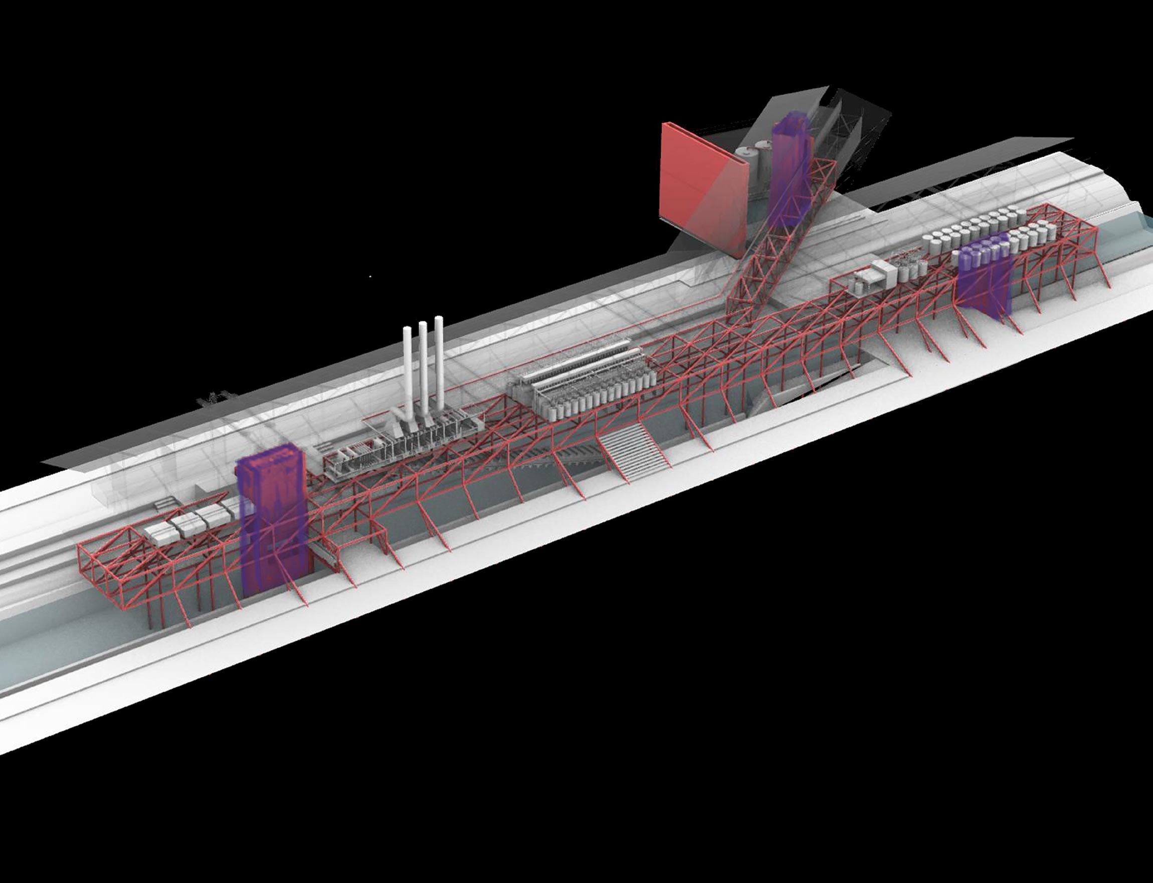 Heavy machinery and water related funtions are close to the core, while the upper frame strcutre act like a skin.