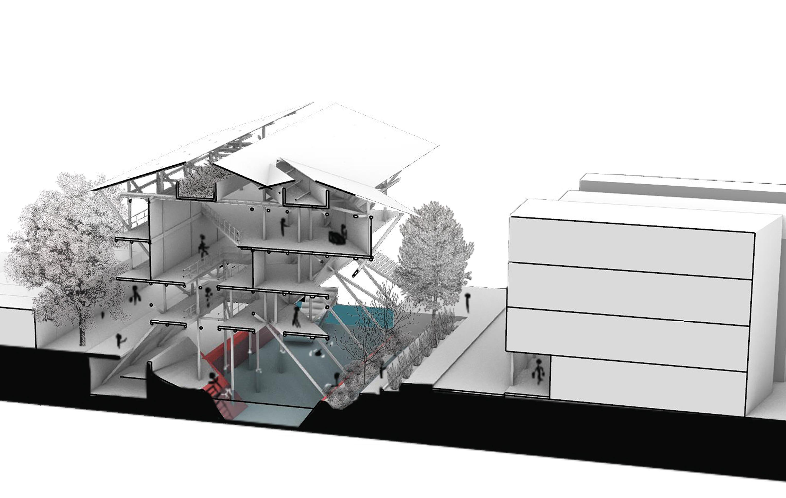 The third floor has the built mass within its center, amd with multiple points of access, the circulation around the floor becomes a part of the larger street.