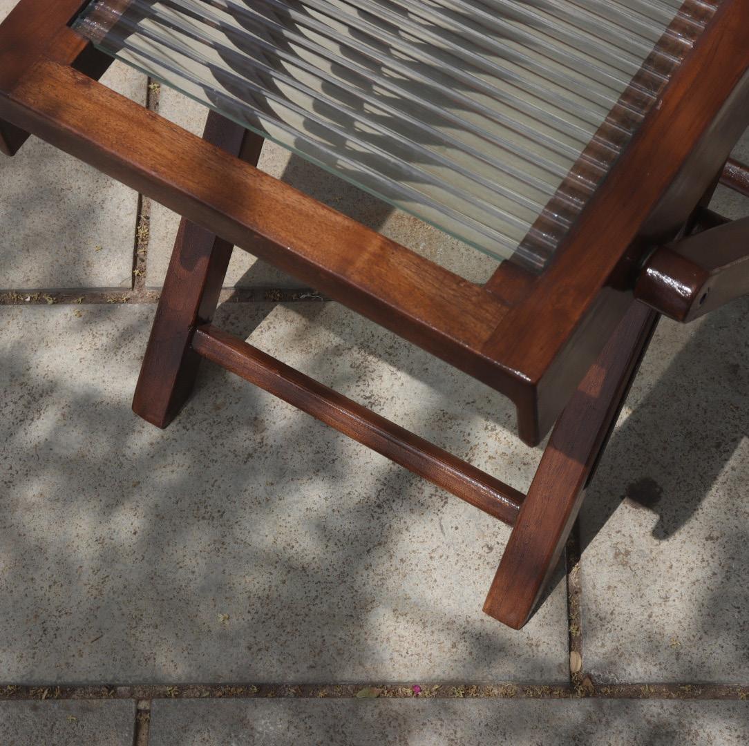 Glasswood table was created to provide the ideal companion for Indhi Glasswood chair, and shares their same inspiration and material: it features a fluted glass as the top and a walnut stain framework, hinged and screw for folding.