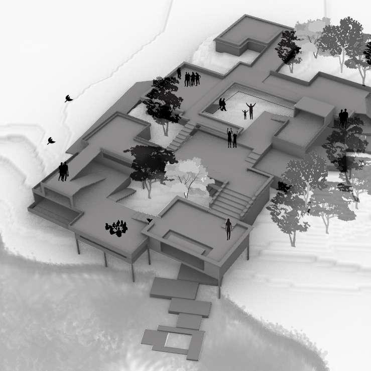 Environment is a set of interconnected networks which balance each other to maintain the rhythmic flows. Negotiating with the terrain and the flora and fauna around, the site is then imagined as a set of interconnections which flow into each other and hence creating an interdependent and coexisting space to generate new spatial priorities which would acknowledge the consequences on the environment by creating spaces where interactions are almost natural and come as a default with the experience of the space. The intent is to design a wet land observatory with an additional function to it. the building is kept lower and sparse to make it merge with the landscape around separated and connect back with a series of staircase and corridors. The building is placed in such a way that it starts from the highest level and slowly moves down towards the water encouraging people to know more about the environment they are living in The entrances being so dynamic allows the user to choose his own way of navigating through the space.